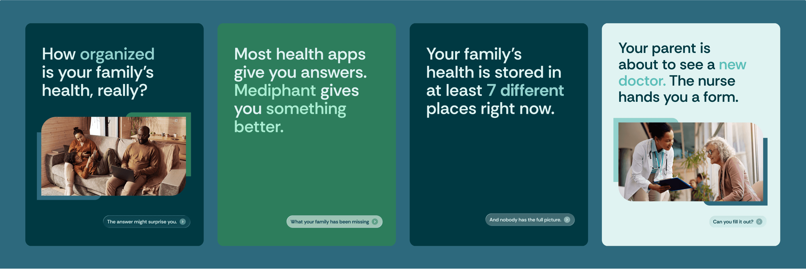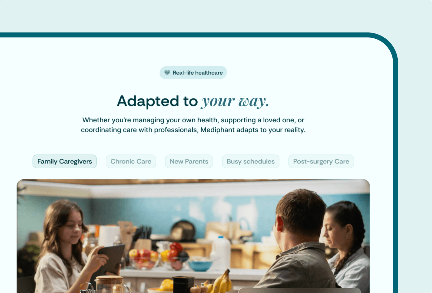 The original positioning emphasized features rather than meaningful outcomes. We shifted the narrative to present Mediphant as a shared, collaborative system for families, centralizing health information to be accessible and actionable. This repositioning clarified the product’s role in daily family life, creating a stronger foundation for all design and communication strategies that drive engagement and growth.
