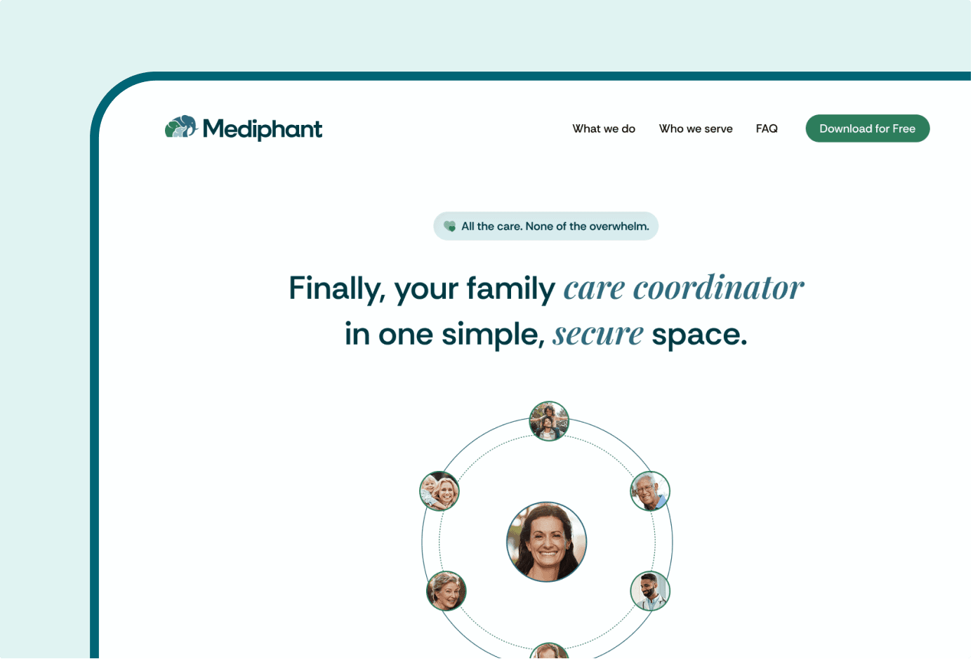 We redesigned the website to showcase how Mediphant seamlessly integrates into families’ daily lives. The previous site made the product feel more complex than it is, creating barriers to engagement. Our new structure emphasizes clarity and reassurance, guiding users through a natural, easy-to-follow journey. Rather than focusing on isolated features, the website highlights real-life benefits staying organized, sharing updates, and keeping everyone informed. The result is a calm, approachable experience that builds trust and encourages users to engage from their very first visit.