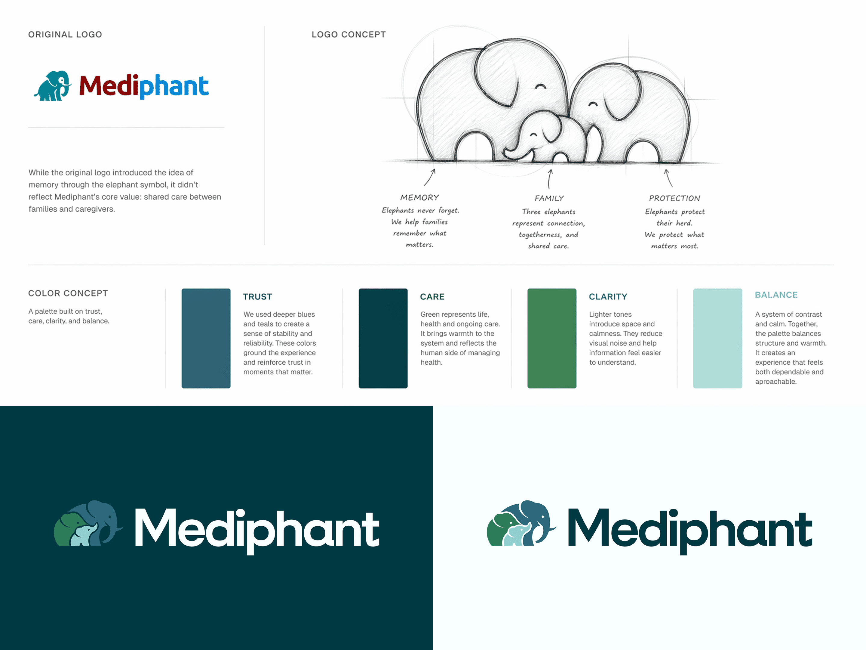 The previous brand didn’t capture the emotional significance of managing family health. We developed a unified identity system that feels calm, clear, and supportive and more like a trusted companion than a clinical tool. Using natural tones to convey stability and reassurance, and soft accents to guide attention gently, the design prioritizes clarity and accessibility. Every element reduces friction and builds user confidence, helping families feel supported rather than overwhelmed. The logo, featuring three elephants, symbolizes the core of the product: families, caregivers, and support systems working together, visually reinforcing the shared responsibility in healthcare.