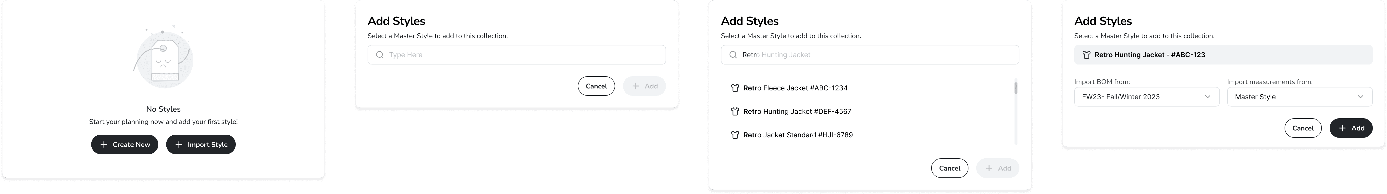 We redesigned the style creation flow to reduce friction and guide users step by step. By introducing progressive disclosure, clearer selection states, and structured inputs, we transformed a previously empty and unclear starting point into a guided, intuitive process that supports faster decision-making and reduces errors.